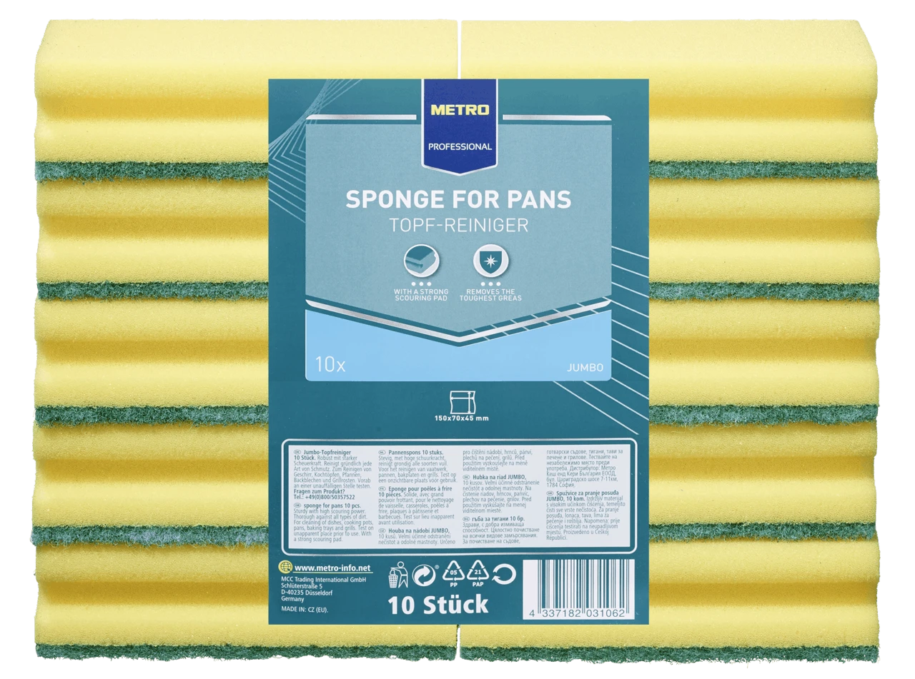 Die METRO Professional Jumbo Topf-Reiniger, in den Farben gelb und grün, bestehen aus Vliesstoff, haben eine rechteckige Form und entfernen die hartnäckigsten Reste. Ideal zum Reinigen von Geschirr, Kochtöpfen, Pfannen und Backblechen.