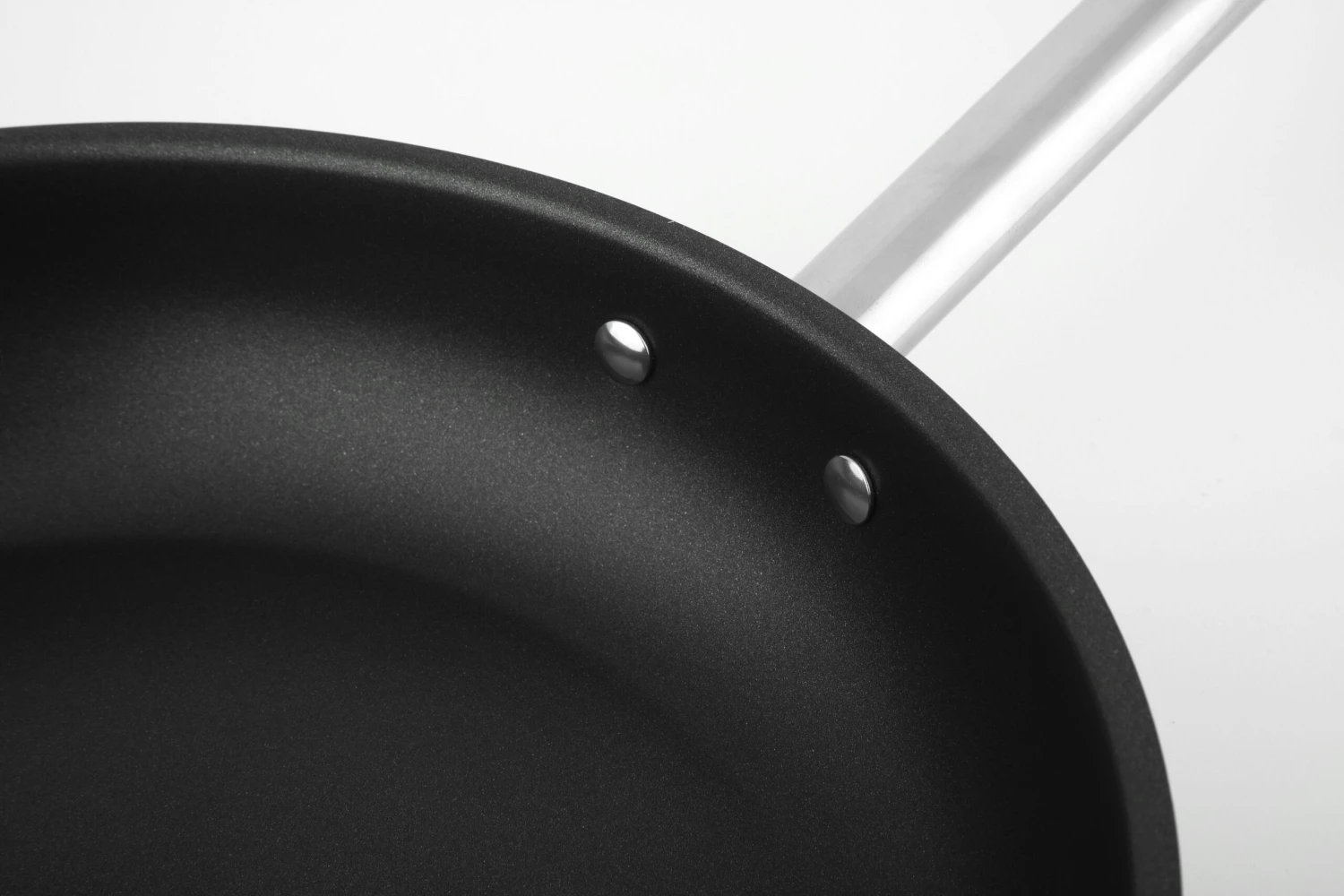 Das METRO Professional Set besteht aus 3 Edelstahlpfannen mit Antihaftbeschichtung. Die Pfannen haben einen Durchmesser von Ø 24, 28 und 32 cm, eine Höhe von 7.6/ 7.8 und 8.5 cm und ihre Böden haben einen Durchmesser von 18 cm (5 mm dick), 22.1 cm (5 mm dick) bzw. 23.9 cm (5.3 mm dick). Sie sind für den Backofen (bis 240 °C) und für Elektro-, Gas-, Glaskeramik- und Induktionsherde geeignet.
